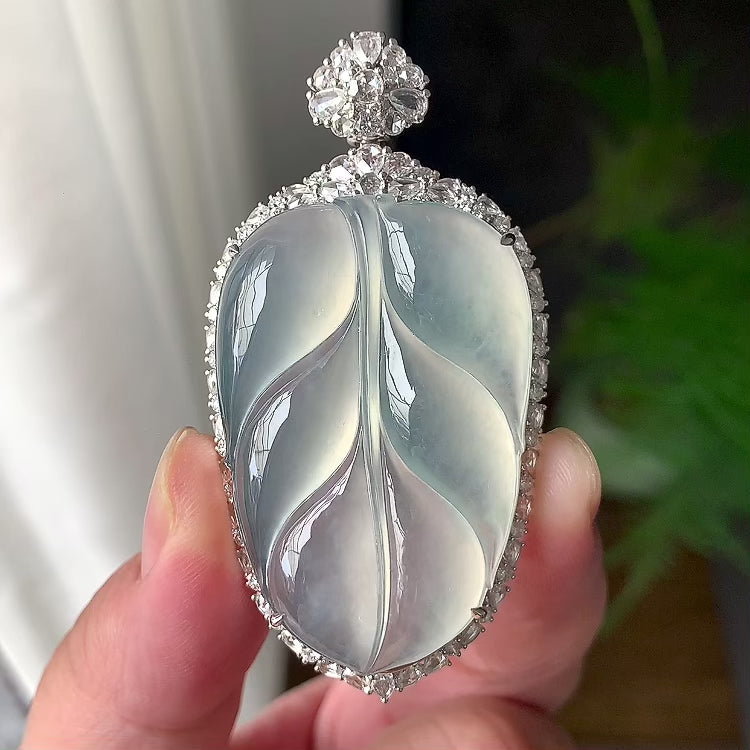 18K金钻镶冰种无色叶子吊坠(yc192467)