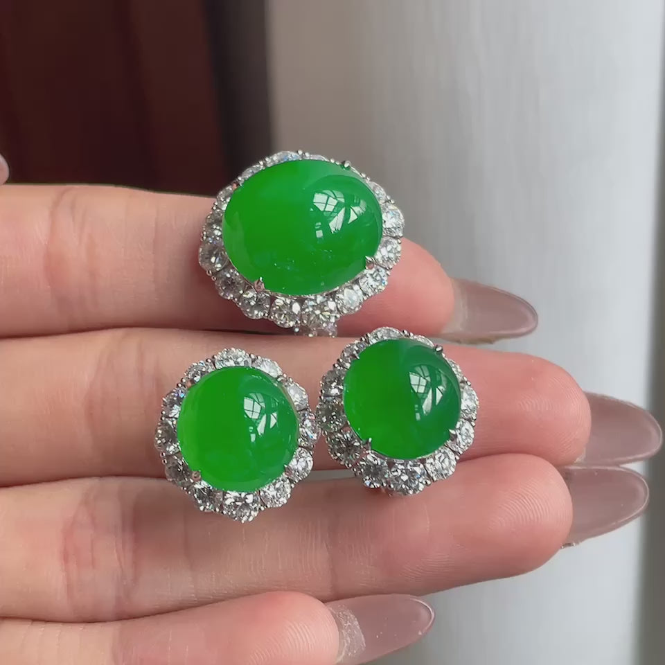 18k金钻镶冰种满绿翡翠蛋面套装(yc195334)