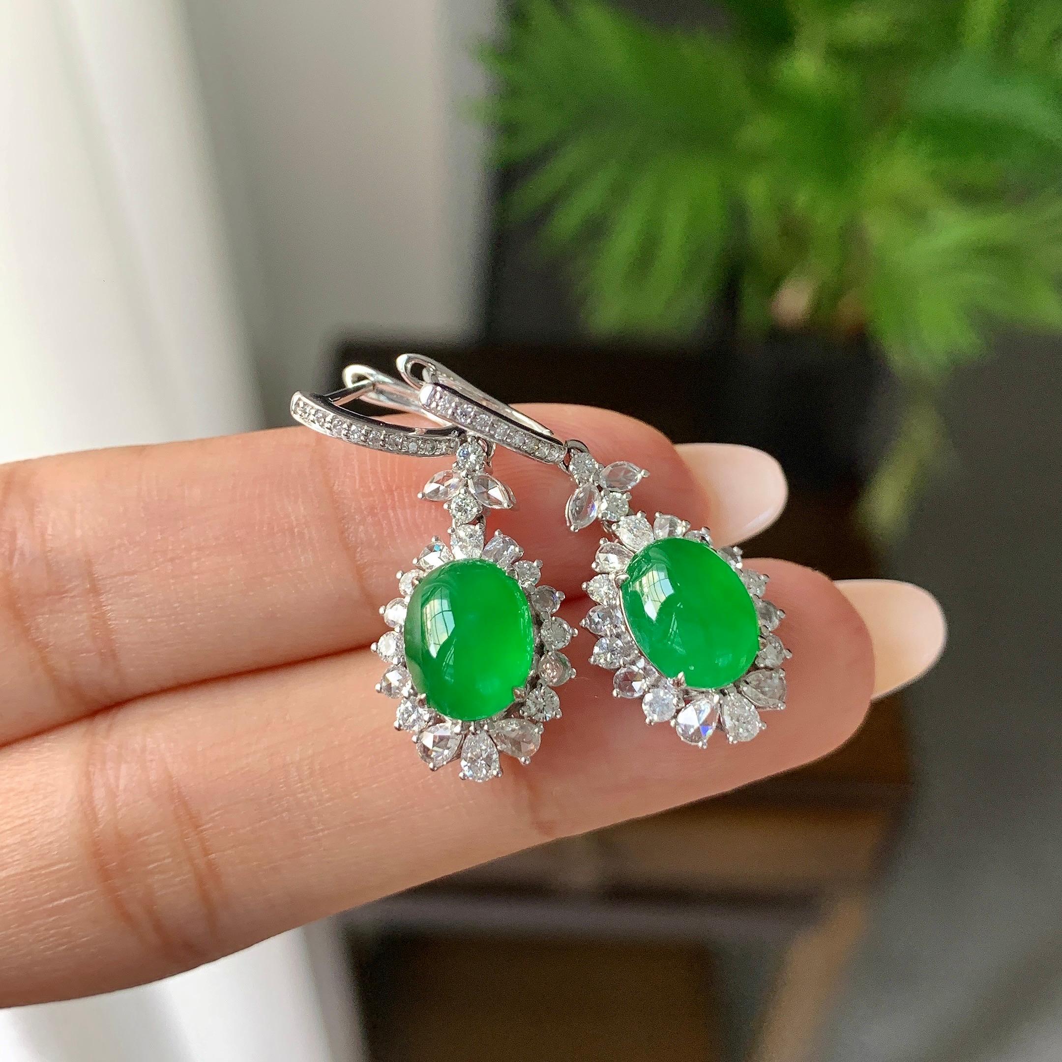18K金钻镶冰种满绿蛋面耳环(yc187318)