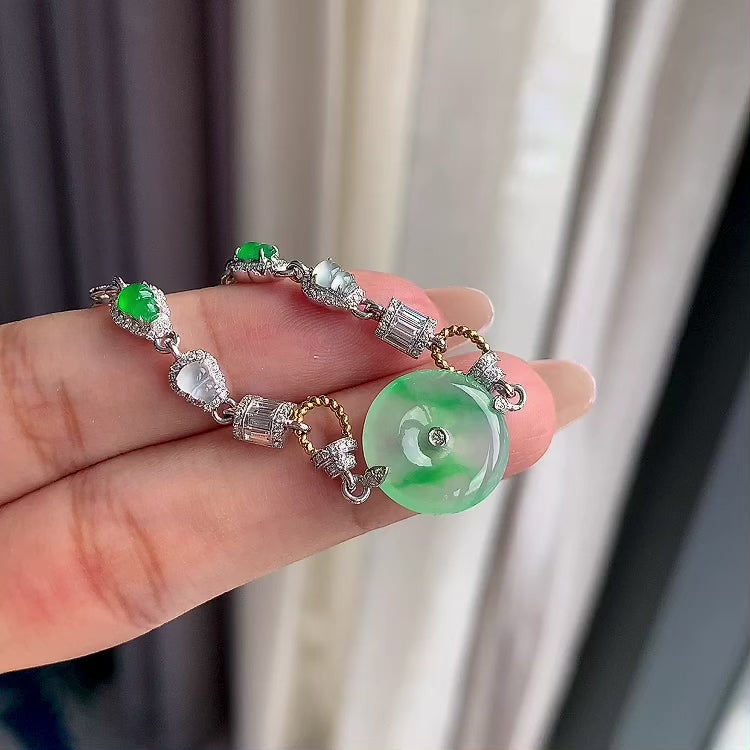 18K金钻镶冰种飘绿平安扣手链(yc187302)