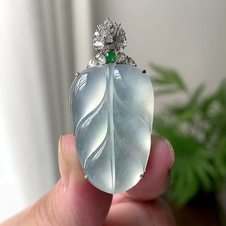 18K金钻镶糯冰种无色叶子吊坠(yc191926)