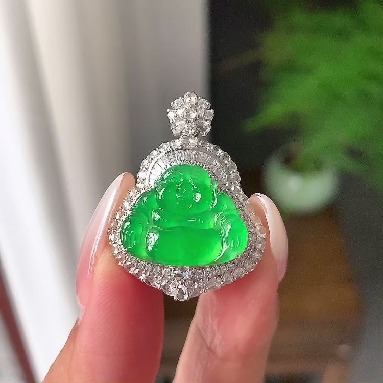 18k金钻镶糯冰种满绿佛公吊坠(yc197682)