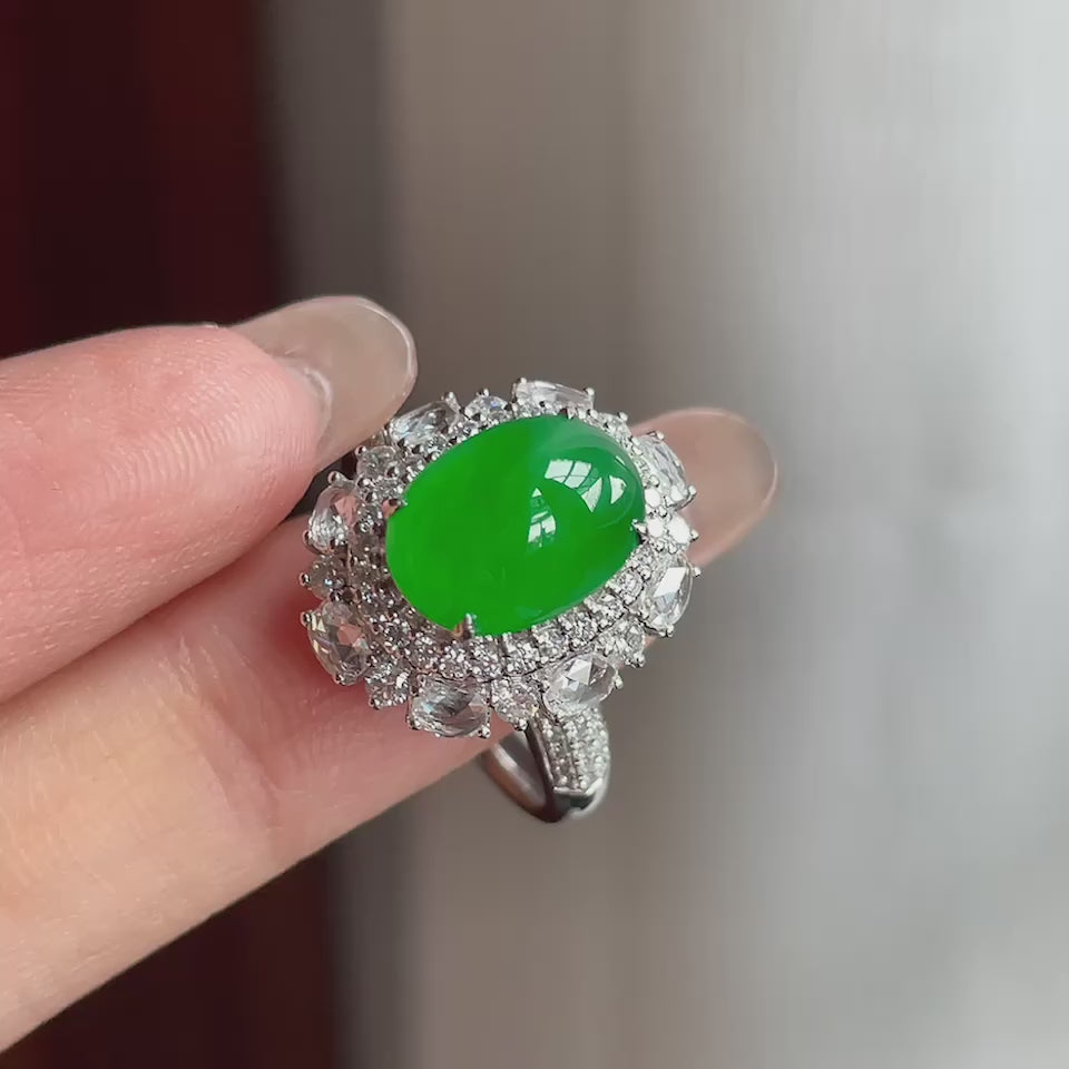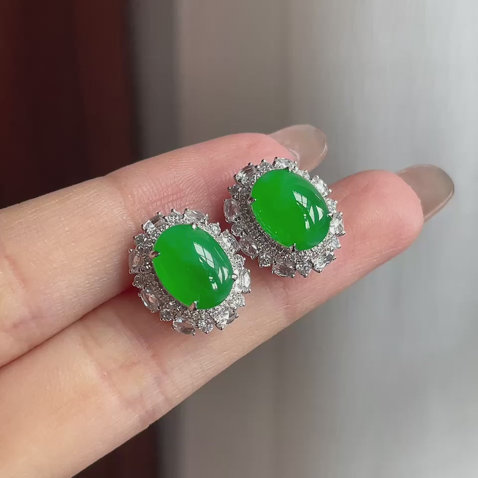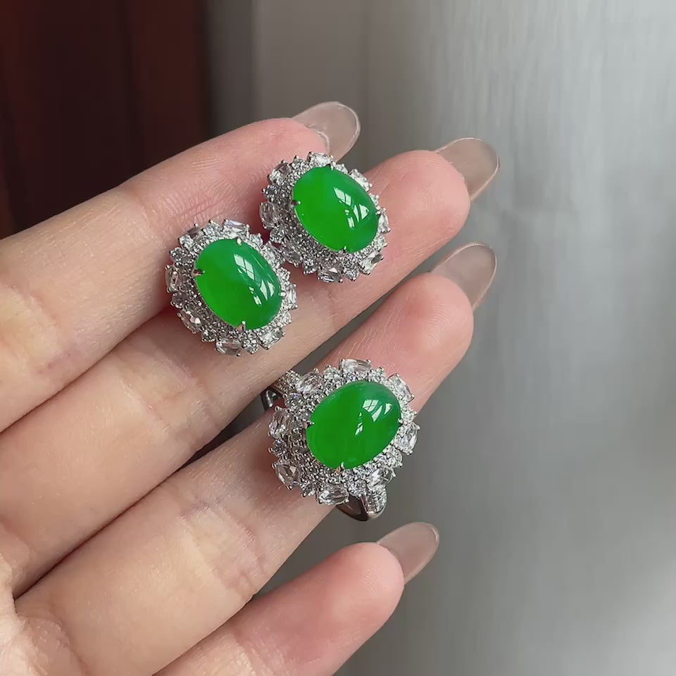 18k金钻镶糯冰种满绿翡翠戒指耳钉套装(yc197232)