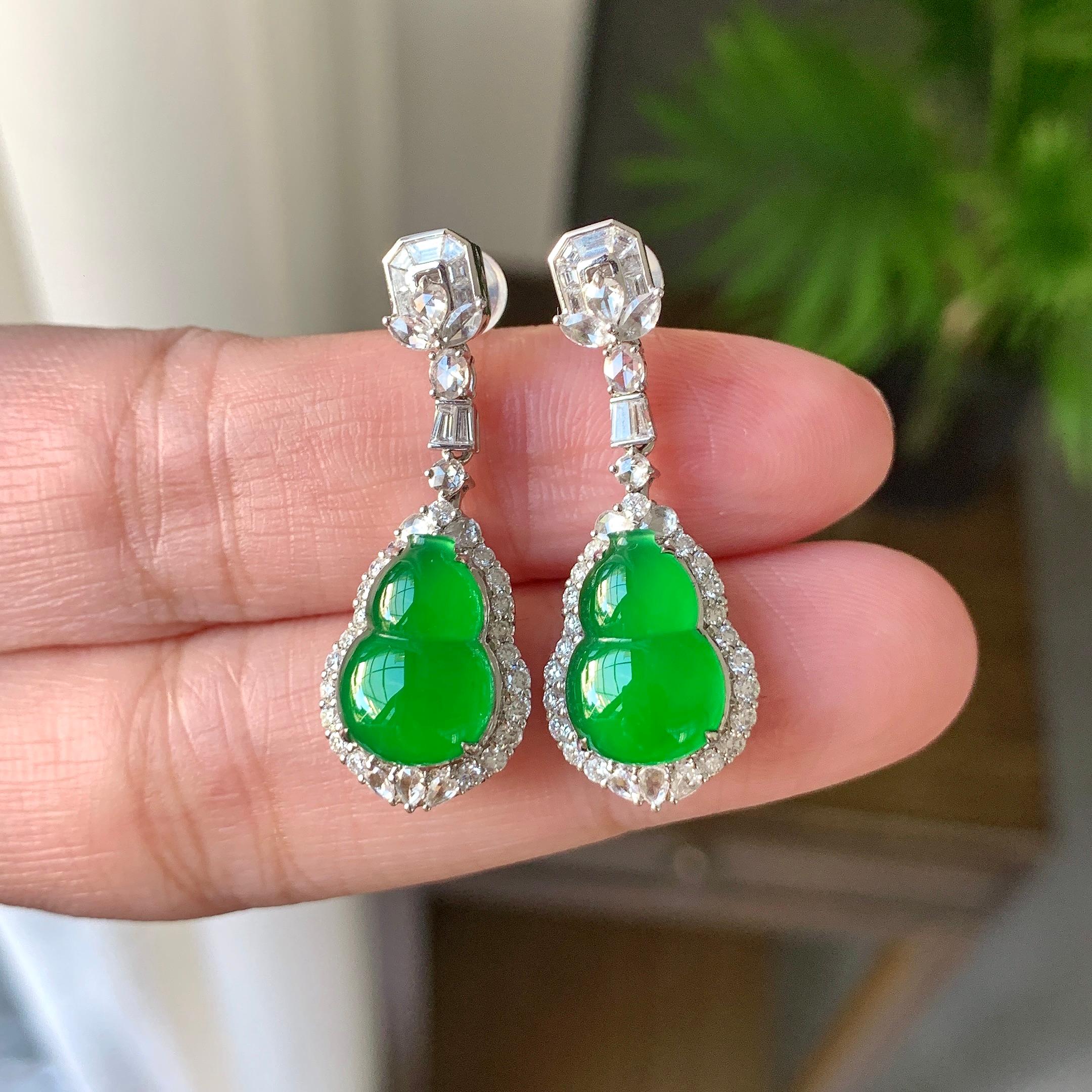 18K金钻镶糯冰种满绿葫芦耳坠(yc226985)