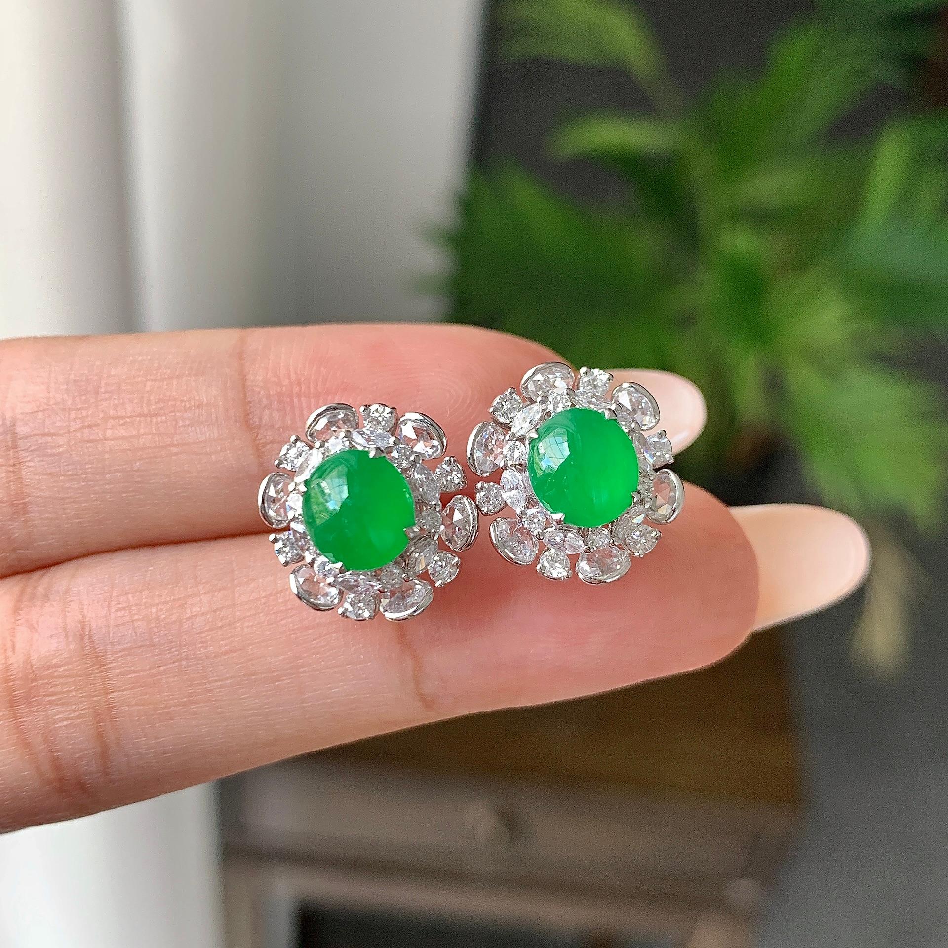 18k金钻镶糯冰种满绿蛋面耳钉(yc201827)