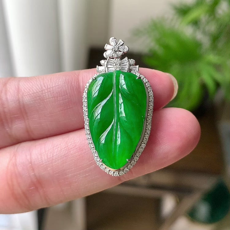 18K金钻镶细糯种满绿叶子吊坠(yc190822)